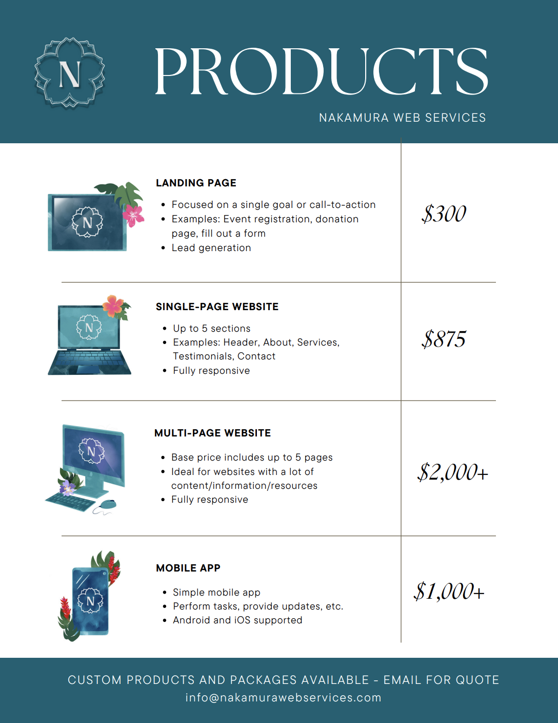 I started Nakamura Web Services in early 2025 after completing KS Kaiāulu’s full stack web and mobile developer bootcamp in partnership with Nucamp, a fast-paced, immersive and hands-on training in modern web development languages, frameworks, and technologies that prepared me to create my own projects and, most importantly, keep learning!